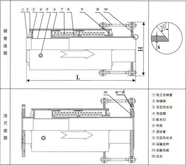 轴向型外压式补偿器(膨胀节)的波纹管两端分别与外筒、内筒相连,波纹管波数较多。受外压作用时,它能吸收较大的轴向位置,常用于热力管道架空管线。此类膨胀节的波纹管两端分别与话筒、内筒相连,波纹管波数较多。受外压作用时,它能吸收较大的轴向位置。 安装使用注意事项: 1.内衬筒方向应与介质流向一致(膨胀节上有流向标志) 2.安装时注意放气口朝上,疏水口朝下。 3.现场安装完毕后,需拆除小拉杆。产品结构简图