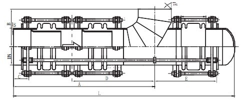 曲管压力平衡波纹补偿器的前部(通道端)有两个工作波纹管,可以吸收来自弯管段产生的横向位移;后部(平衡端)有一个平衡波纹管,它可以吸收来自直管段的轴向位移.当弯管段产生横向位移时,大拉杆上球螺母绕球面垫圈转动,同时大拉杆承受内压的推力,因此该补偿器常用于泵、罐、压缩机、汽轮机出口处,以减少对上述设备的作用力。 曲管压力平衡波纹补偿器适用于石化、钢铁、电力、有色金属等部门。安装在管道的拐弯处或与设备相连的空间管道上。它能补偿轴向位移、横向位移,耳不会对管道系统或者其他设备产生内压推力。 曲管压力平衡波纹补偿器常用于泵、空压机、汽轮机及其它对载荷敏感的管道系统。能迅速衰减由于启动、停车等引起系统压力波震动,消除水击,而能吸振降噪,保证设备安全运行。 大拉杆是承受压力载荷的构建,吸收横向位移是相对于撑板要有一定的偏摆,使用时其上的紧固螺母要旋到位又要避免旋压过紧而影响活动;小拉杆是安装、运输、调整时起作用,不可作为承力件,管道安装完毕后,小拉杆需拆除方可投入运行。 产品结构简图