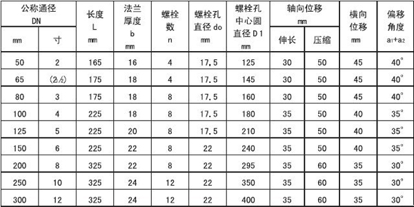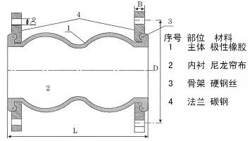 双球橡胶补偿器系内胶层,多层尼龙帘布增强,外胶层复合的橡胶双球体和松套金属法兰组成的产品。产品具有耐压高、弹性好、位移变形量大、吸振降噪效果明显、安装灵活等特点。产品详细介绍 该产品系内胶层,多层尼龙帘布增强,外胶层复合的橡胶双球体和松套金属法兰组成的产品。产品具有耐压高、弹性好、位移变形量大、吸振降噪效果明显、安装灵活等特点,可用于给水排水、暖通空调、消防、压缩机、制药、造纸、船舶、化工、卫生、风机等管道系统。 可曲挠橡胶接头选用说明: 1. 橡胶接头常规适用温度-200~70℃.瞬间温度可达115℃,使用温度为70~115℃。 2. 法兰连接橡胶接头,在工作压了和工作温度较高的(通径200以上、温度70℃以上、工作压力1.5Mpa以上),可选用配有限位装置的法兰橡胶接头。 3. 法兰连接的橡胶接头,在安装时连接法兰的螺栓要从法兰的内侧分别串向法兰两端,要交垫圈或弹簧垫圈,螺栓要对角逐步拧紧。 活接头连接的橡胶接头,在安装时左右两端的活接头不要调换,以免引起产品的泄露或损坏。 产品结构简图产品技术参数